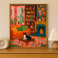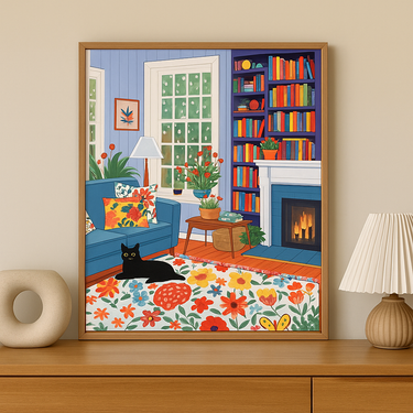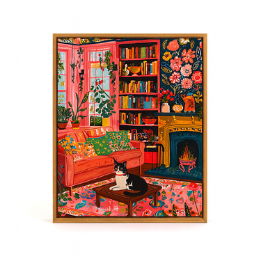 The Cozy Whiskers Collection brings warmth, charm, and personality into your home with a series of vibrant cat-inspired paintings. Each artwork captures a peaceful moment of everyday life — from lounging by a crackling fireplace to napping among blooming plants. The playful details, rich colors, and cozy settings make these pieces perfect for adding character to your living room, bedroom, or reading corner.